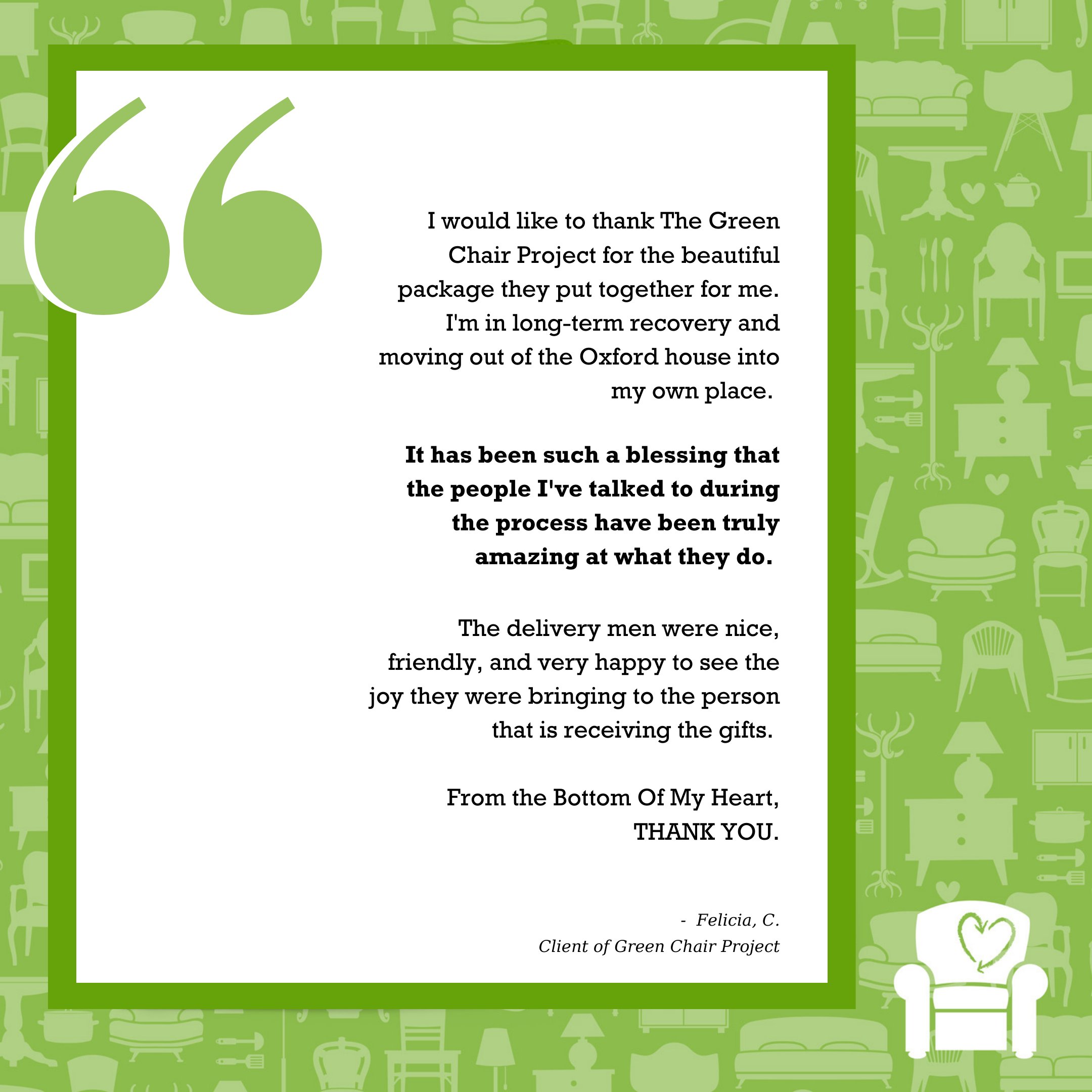 Thank you for choosing The Green Chair Project to donate your. The Green Chair Project offers packages ranging from 100 to 300 with the idea that the 100 package can furnish a one-bedroom apartment the 200 package can furnish a. Chair Assembly Middlesex County Costs.